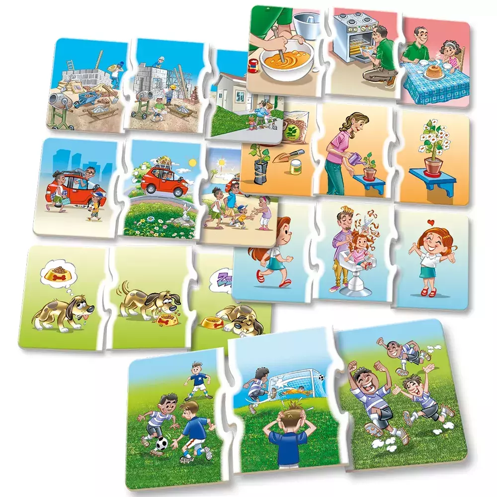 "Trio logico envolve a atividade de associação e relação da ordem cronológica entre as cenas. Um jogo no qual a criança observa e compara as ilustrações de cada uma das cartelas para reconhecer a relação entre elas. Ao encaixar as peças seguindo a ordem dos acontecimentos, a criança forma uma sequência composta por três partes resultando em uma cena completa."